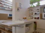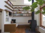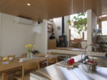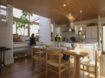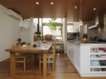 静かに緑陰を味わう場所と、賑やかに食を楽しむ場所という、一見相反する空間でありながら、リビングの床を80㎝ほど高くすることで、ダイニングスペースとは明確に区別されながらも二つの空間が緩やかにつながり、それぞれに自分の空間を損なうことなくお互いの雰囲気をも味わうことが出来ます。