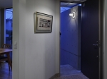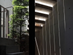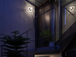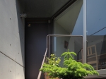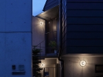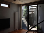 玄関へのアプローチ階段を支えるコンクリートの壁は、プライバシーを守る目隠しでありながら太陽光を導くリフレクタとしての役割を持ち、西向きのダイニングに午前中から明るさをもたらすとともに、地下室へ光を導く光庭を構成しています。