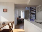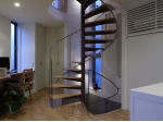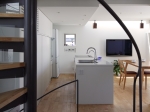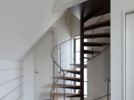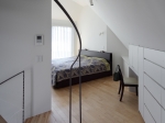 地下から最上階のロフトまでを貫く螺旋階段は、吹き抜けのように家全体をひとつの空間として結びつけ、また視野を遮らないことで伸びやかな内部空間を演出しています。