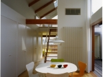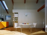 天井にあらわされ頂部のトップライトを横切る登り梁が、大きなワンルームのようなシンプルな空間にリズムとスケール感を生み出しています。テラスに面する木製建具は全て開け放つと、テラスとダイニングは一体となり、より一層の広がりが生まれます。ロフトの窓からは新宿の高層ビル街の景観を楽しむことが出来ます。