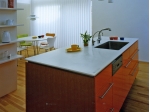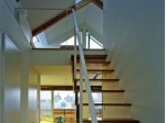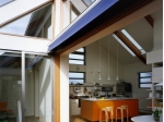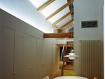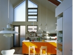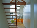 2階子世帯はパン教室の開かれるオープンキッチンを中心として、豊かな採光と、立地を生かした眺望と開放感を求めました。親世帯とは対照的に空を意識した空間です。キッチンはディテールまで施主のこだわりを実現するためにオーダーメードで製作しました。