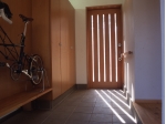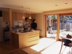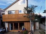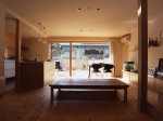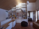 余裕のある敷地環境を活かすように、1階は、南側の庭から北側隣家庭木の借景まで、のびやかに抜けの得られるよう、全て引き戸の間仕切りで構成し、2階は天井の高いファミリールームを中心に各部屋とも、贅沢に光と緑を取り込む空間となっています。